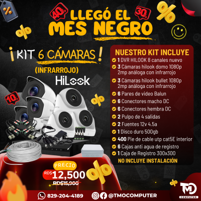 Kit de 6 cámaras IP HiLook/Hikvision de 2MP con NVR POE de 8 canales. Incluye domos y bullets Full HD, 1TB de almacenamiento, 500 pies de cable y cajas de registro. Solución profesional con conexión estable y monitoreo remoto.