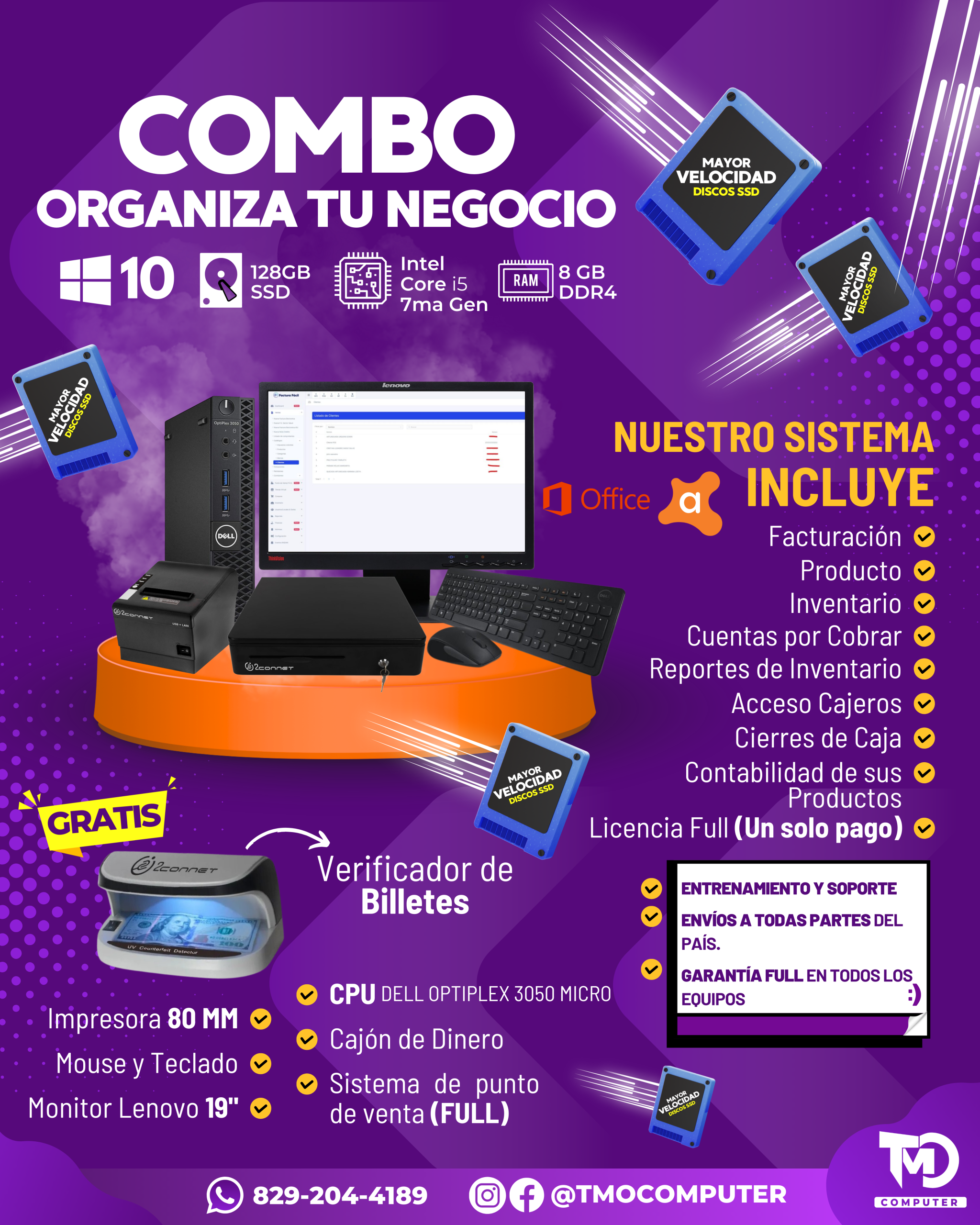 Alto rendimiento con CPU Dell Intel Core i5 7ma generación, 8GB de RAM y SSD de 128GB. Incluye monitor Lenovo Widescreen 19″, impresora térmica de 80mm, cajón de dinero, teclado, mouse y verificador de billetes GRATIS. Funciones completas: facturación, inventario, cuentas por cobrar, reportes y cierres de caja. Licencia de un solo pago y soporte nacional.
